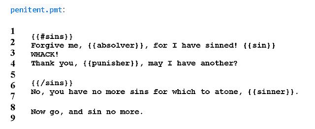 Unless you’re old enough, growing a mustache can take a while. For your convenience in the meantime, feel free to cut and paste the following Mustache code to your upper lip, then save it in a file called penitent.pmt.